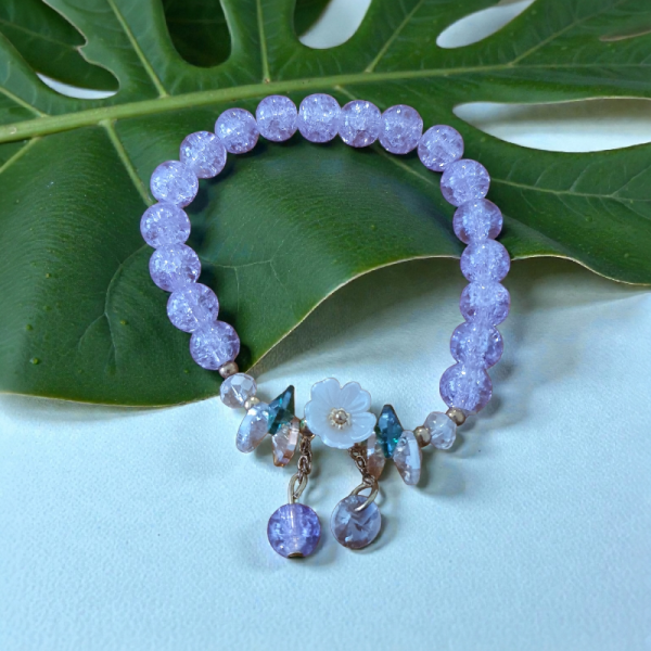 Bracelet élégant composé de perles rondes lila/violet clair à effet craquelé, montées sur un fil élastique pour un port confortable et facile. Le centre est orné d’une fleur blanche nacrée, mise en valeur par des perles aux reflets violet, lavande et translucides. Deux pendentifs en perles facettées, suspendus à de fines chaînettes argentées, ajoutent une touche de légèreté et de mouvement.