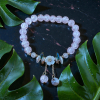 Bracelet délicat composé de perles rondes rose pâle à effet craquelé, montées sur un fil élastique pour un port confortable au quotidien. Au centre, une fleur blanche nacrée est mise en valeur par des perles aux reflets rose clair, opaline et translucides. Deux pendentifs en perles facettées, suspendus à de fines chaînettes argentées, apportent une touche élégante et aérienne.