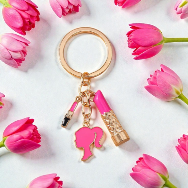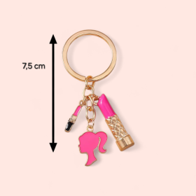 Affirmez votre style avec ce porte-clés tendance inspiré de l’univers de la beauté et du maquillage. Il se compose d’un anneau doré élégant et de plusieurs pendentifs raffinés : un rouge à lèvres rose, un pinceau maquillage et une silhouette féminine barbie, pour un look moderne et glamour.